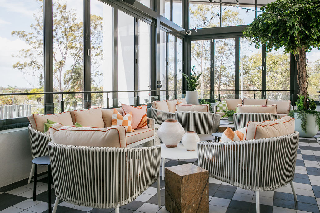 Eden Living was proud to supply a curated selection of furniture to elevate the outdoor and indoor dining areas, including our Artemis dining chairs and lounge settings, all customised in vibrant burnt-orange cushions. The bold yet refined upholstery adds a warm, energetic contrast to the soft-toned finishes and leafy surrounds, bringing character and comfort to every corner of the venue.