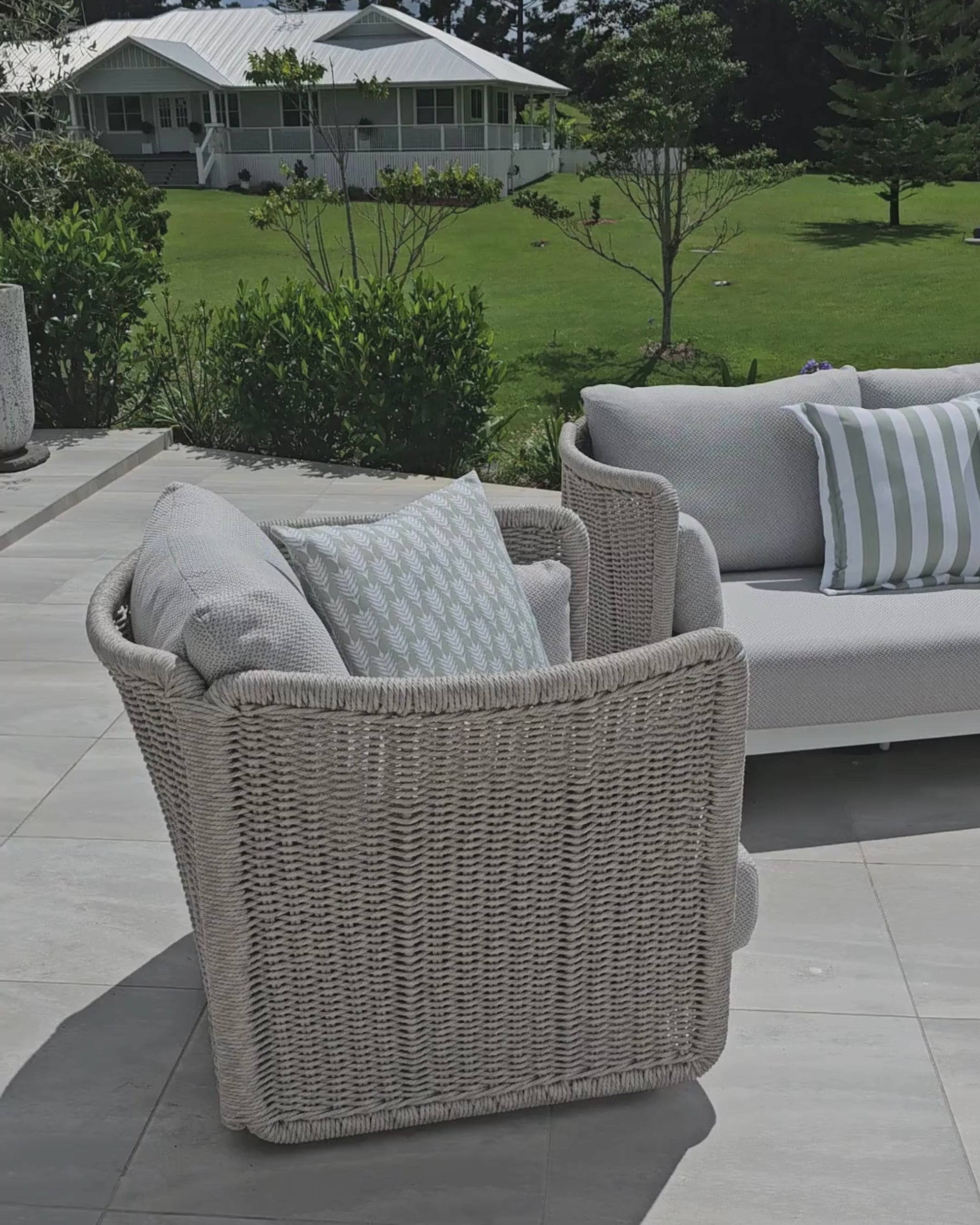 The lounge features a distinctive twisted wicker in Dove Grey, offering a versatile, stylish foundation that complements a range of outdoor settings. Crafted from durable materials including water-repellent Sunproof olefin, it’s designed to resist stains, moisture, and daily wear, delivering long-lasting comfort and resilience.