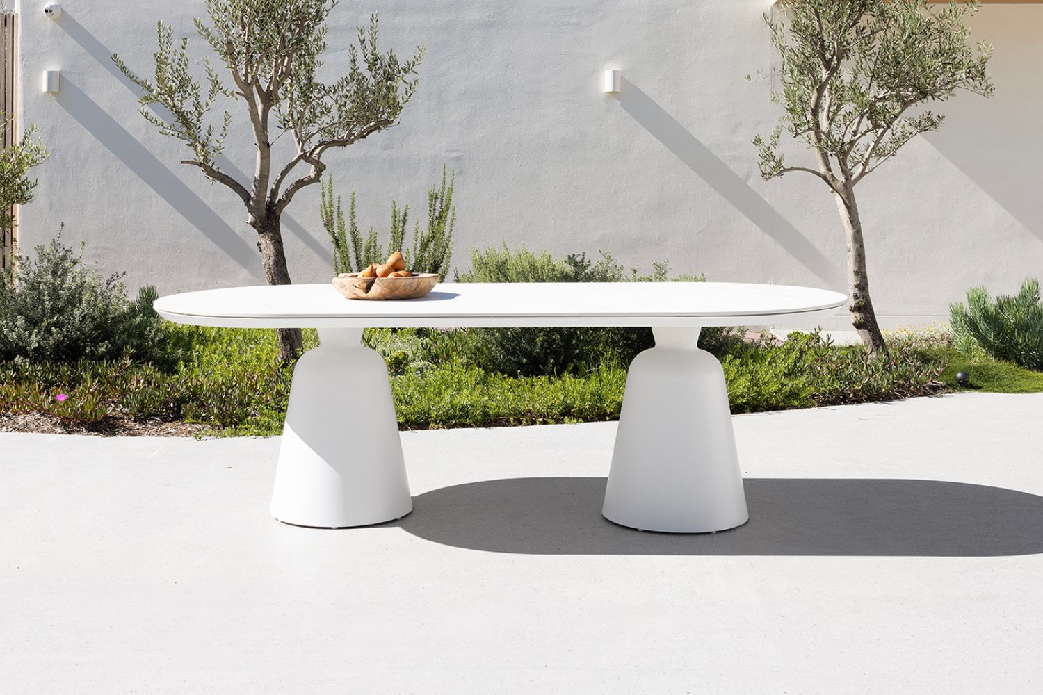 The Ponte & Marbella Dining Setting is graceful and contemporary. The fluid form of the ceramic Ponte Table combined with the natural finish of the Marbella Dining Chairs evoke a sense of harmony and balance.