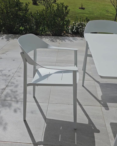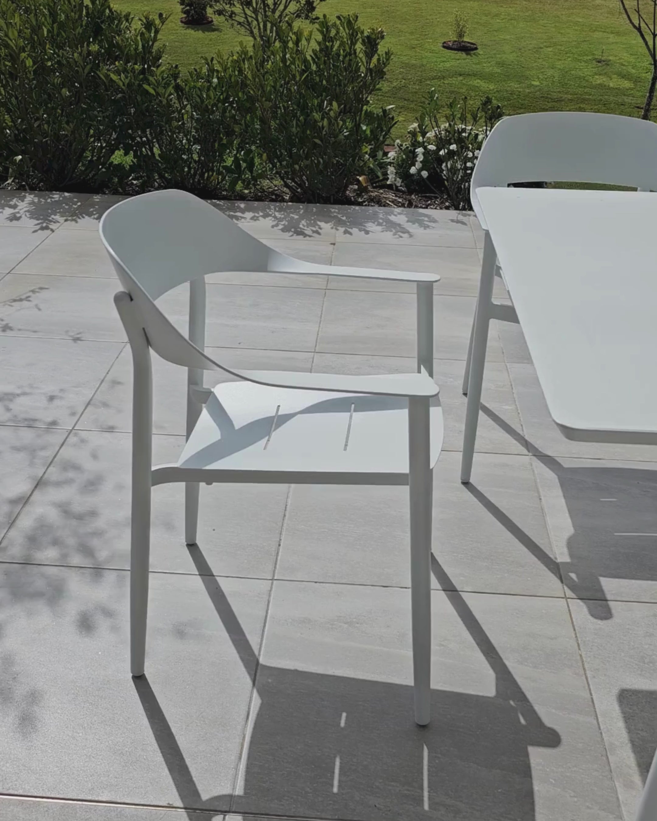 Lightweight yet sturdy, the Tala Chair pairs a smooth contoured seat with slim sculpted arms for modern comfort indoors or out. Crafted from durable materials and designed to stack with ease, it offers sleek functionality and effortless style for any dining setting.